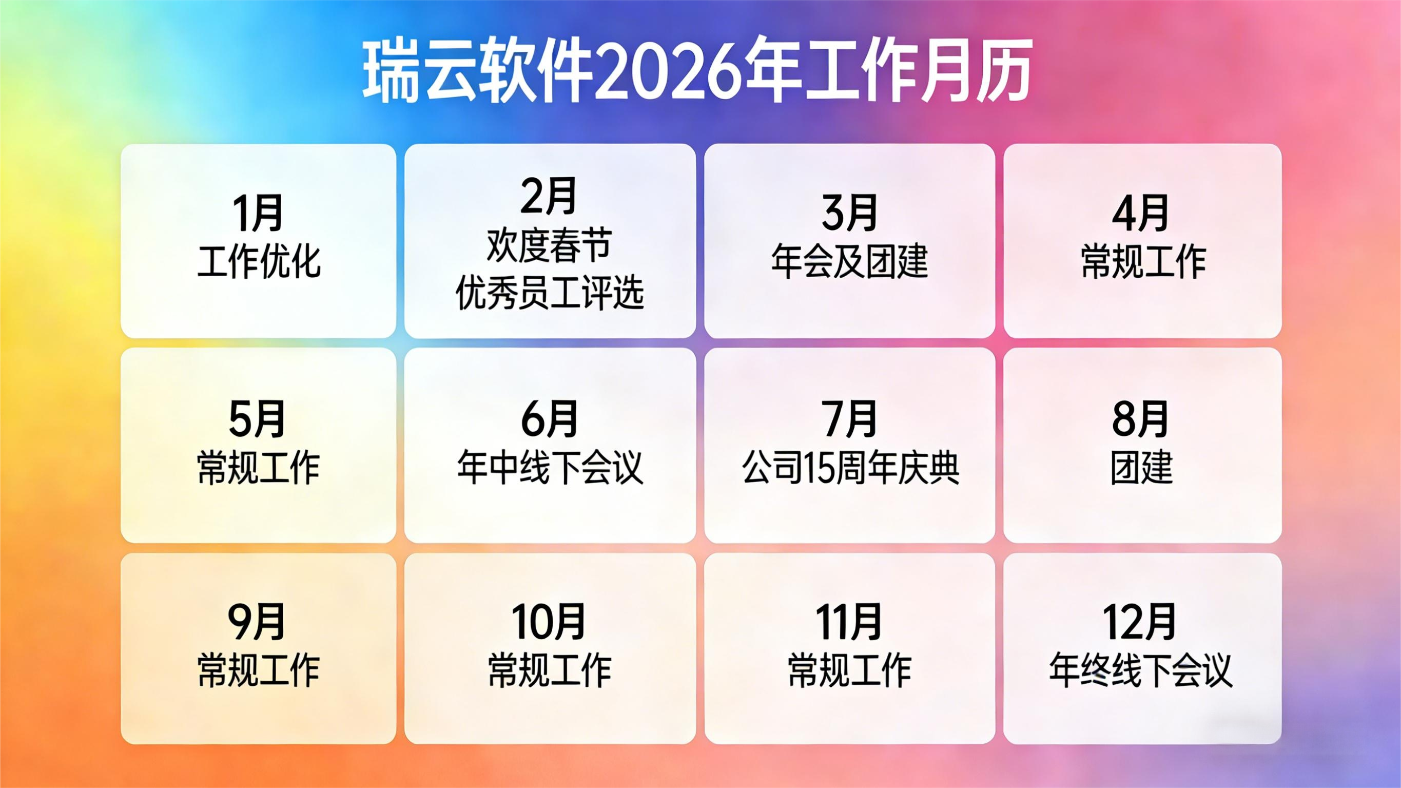 瑞云软件总部发布公司2026年工作月历,各团队在元月份进行梳理,砍柴不误磨刀工,做好工作优化分析。