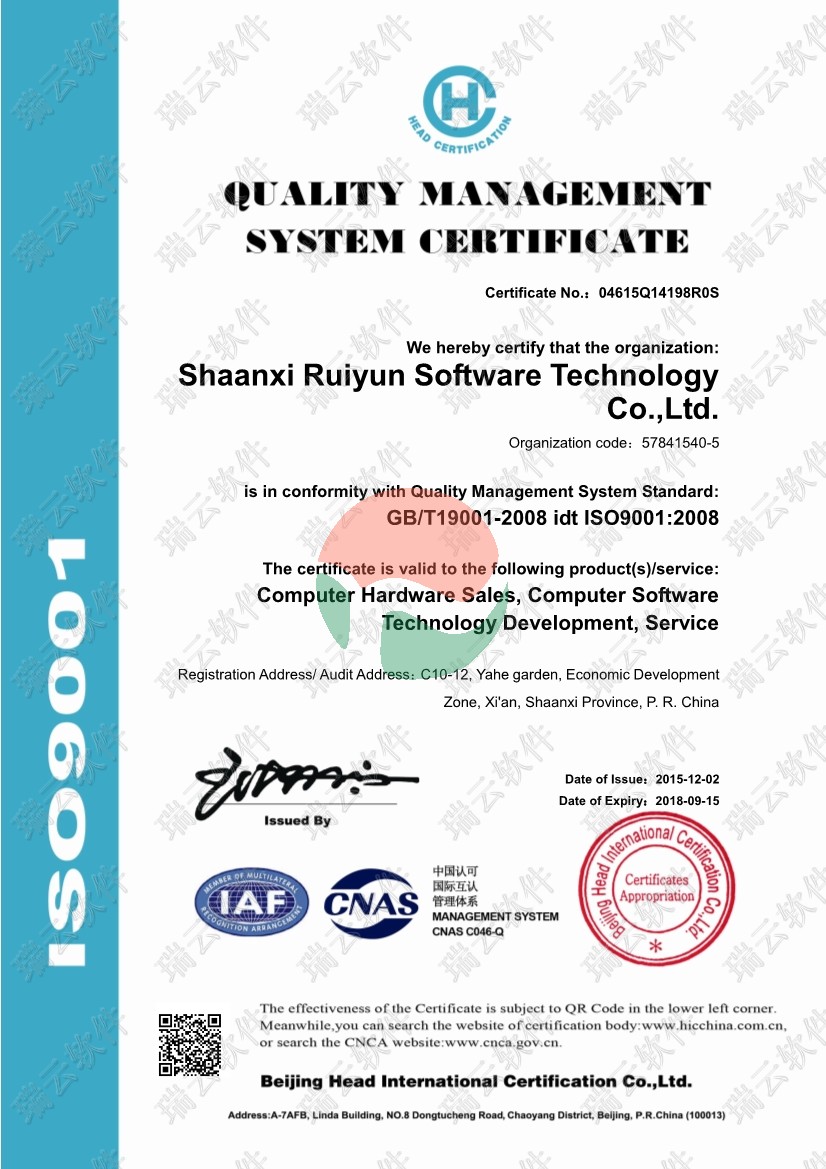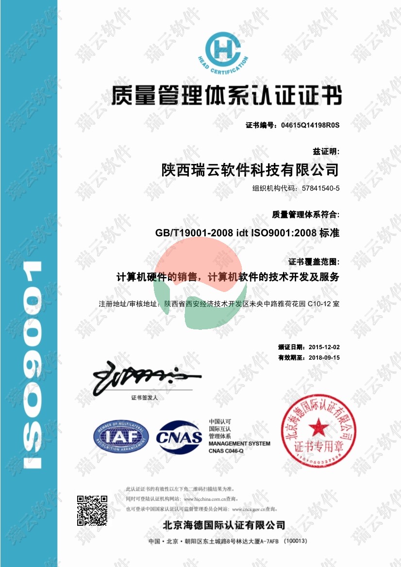 获得ISO9000质量管理体系认证是公司规范化管理新的起点,瑞云软件将在规范化管理的大道上奋勇前进!